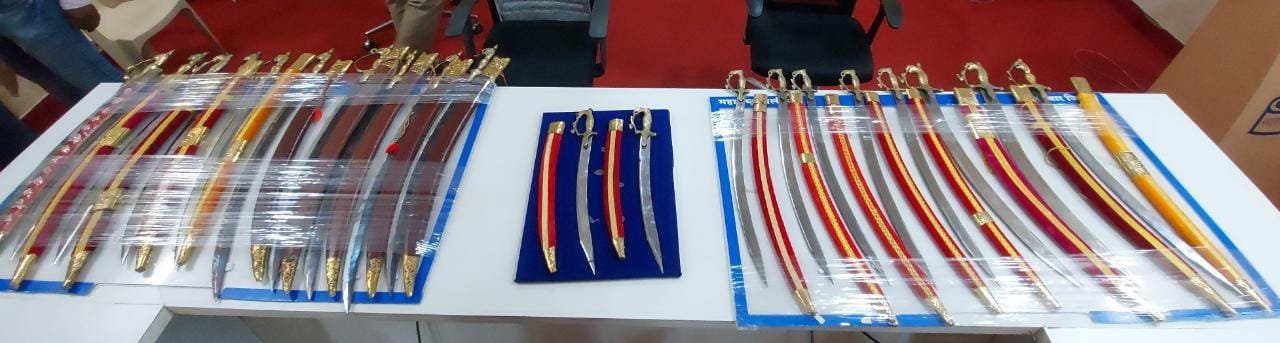 जिल्हा पोलीस अधीक्षक कार्यालयाने दिलेल्या माहितीत म्हटले आहे की, आगामी जिल्हा परिषद व पंचायत समिती पोट निवडणुक-2021 व नवरात्रौत्सव दरम्यान समाजकंटकांवर गुन्हेगारांवर अंकुश राहावा तसेच निवडणूका व सण उत्सव भयमुक्त वातावरणात पार पाडावेत यासाठी दक्षता म्हणून नंदुरबार जिल्हा पोलीस अधीक्षक पी.आर. पाटील यांनी स्थानिक गुन्हे शाखेला अवैध शस्त्रांवर कारवाई करणयाचे आदेश दिले होते. त्या अनुषंगाने दिनांक 4 ऑक्टोबर 2021 रोजी स्थानिक गुन्हे शाखेचे पोलीस निरीक्षक रविंद्र कळमकर यांनी पथकाच्या मदतीने गुप्त बातमीच्या आधारे धडगाव गावात मुख्य रस्त्यावर छापेमारी केली. एक इसम हा त्याच्या शेती औजार विक्रीच्या दुकानात लोखंडी बनावटीच्या तलवारी बेकायदेशीर कब्जात बाळगून असल्याचे त्यावेळी आढळून आले. संजय कागडा वळवी, वय ३८ वर्षे, ता. धडगाव जि.नंदुरबार असे त्याने नाव सांगितले. त्याच्या मालकीच्या टपरीची झडती घेतली असता तिथे1 लाख 28 हजार रुपये किमंतीच्या 20 लहान-मोठ्या धारदार तलवारी मिळून आल्या. संजय कागडा वळवी याच्या विरुध्द धडगांव पोलीस ठाण्याला भारतीय हत्यार कायद्यान्वये गुन्हा दाखल करण्यात आलेला आहे. ही कारवाई पोलीस अधीक्षक पी. आर. पाटील यांच्या नेतृत्वाखाली अपर पोलीस अधीक्षक विजय पवार, स्थानिक गुन्हे शाखेचे पोलीस निरीक्षक रविंद्र कळमकर, सहा. पोलीस निरीक्षक संदीप पाटील पोलीस हवालदार विनोद जाधव, पोलीस नाईक जितेंद्र अहिरराव, पोलीस अमंलदार अभिमन्यू गावीत दिपक न्हावी, रमेश साळुंके यांनी केली आहे.