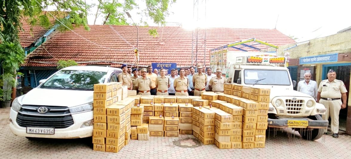प्राप्त माहितीनुसार गुजरात राज्यात दारूबंदी असतानाही महाराष्ट्राच्या सीमा वरती भागात असलेल्या नंदुरबार जिल्ह्यातून मध्य प्रदेश हरियाणा व गोवा राज्यातील दारूची गुजरात राज्यात तस्करी होत असल्याच्या तक्रारी जिल्हा पोलीस अधीक्षक पी आर पाटील यांना प्राप्त झाल्याच्या या अनुषंगाने त्यांनी जिल्ह्यातील सर्व प्रभारी अधिकाऱ्यांना कारवाई करण्यासंदर्भात आदेशित केले होते या आदेशाच्या अन्वये नंदुरबार शहर पोलीस ठाण्याचे पोलीस निरीक्षक रवींद्र कळमकर हे स्वतः त्यांच्या दोन वेगवेगळ्या पथकासह शहरातील जगतापवाडी परिसरात रस्त्यावर सापळा रचत त्यांनी येणाऱ्या जाणाऱ्या वाहनांची बारकाईने तपासणी केली या तपासणीत एका महिंद्रा पिकअप वाहन क्रमांक एम एच ३९ सी ७३०६ या वाहनाची तपासणी केली असता यात वाहनातून १४,४०,७६८ रुपये किंमतीचे रॉयल ब्ल्यू माल्ट व्हिस्की चे २५६ खोके ६,००,००० रुपये किंमतीचे पिकअप वाहन असा एकूण २०,४०,७६८ रुपयांचा मुद्देमाल जप्त केला. तपासात मिळालेल्या माहितीनुसार जगतापवाडी परिसरात मुकेश चौधरी यांच्या घरासमोर उभ्या इनोव्हा वाहनांची तपासणी केली असता त्या वाहनातून ४,३०,०८० रुपये किंमतीचे माल्ट व्हिस्कीचे ८० खोके आणि २१,००,००० किंमतीची इनोव्हा वाहन असा एकूण २५,३०,०८० लाखांचा मुद्देमाल जप्त करण्यात आला. दोन्ही कारवाईत १८ लाख ७० हजार रुपये किमतीचा अवैध विदेशी मद्यसाठा व २७ लाख रुपये किमतीचे दोन चार चाकी वाहन असा एकूण ४५ लाख ७० हजार रुपये किमतीचा मुद्देमाल कायदेशीर प्रक्रिया करून जप्त करण्यात आला. याप्रकरणी नंदुरबार शहर पोलीस ठाण्यात महाराष्ट्र दारूबंदी कायदा कलम 65 ई 108 प्रमाणे मुकेश अर्जुन चौधरी वय ३३ वर्ष राहणार म्हसावद शिवाजी बाबुलाल चौधरी वय २९ वर्ष राहणार नंदुरबार आणि पळून गेलेला एक इसम अशा तिघांवर गुन्हा दाखल करण्यात आला सदाची कारवाई पोलीस अधीक्षक श्री पी आर पाटील अपर पोलीस अधीक्षक निलेश तांबे उपविभागीय पोलीस अधिकारी संजय महाजन यांच्या मार्गदर्शनाखाली पोलीस निरीक्षक रवींद्र कळमकर सहाय्यक पोलीस निरीक्षक चंद्रकांत पाटील पोलीस उपनिरीक्षक विकास गुंजाळ पोलिस हवालदार जगदीश पवार राजेश येलवे दीपक गोरे पोलीस नाईक भटू धनगर बलविंदर स्वप्निल पगारे नरेंद्र चौधरी पोलीस अंमलदार किरण मोरे इमरान खाटीक राहुल पांढारकर अनिल बडे युवराज राठोड यांच्या पथकाने केली.