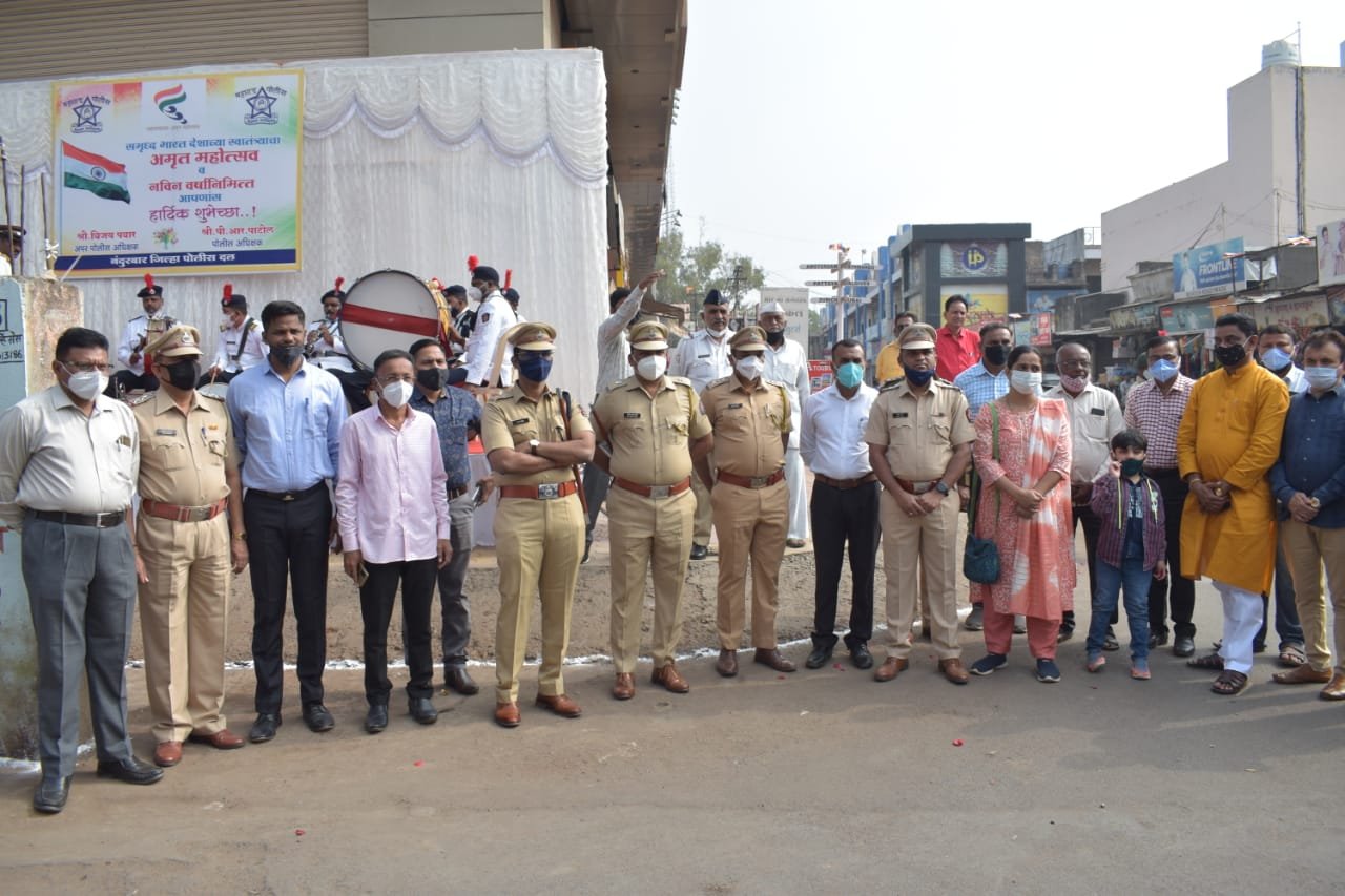 नंदुरबार जिल्हा पोलीस दलातर्फे नंदुरबार जिल्हा पोलीस अधीक्षक पी. आर. पाटील व अपर जिल्हा पोलीस अधीक्षक श्री. विजय पवार यांच्या उपस्थितीत “अमृत महोत्सवी भारत” या उपक्रमाचे औचीत्य साधून नंदुरबार जिल्ह्यातील सर्व नागरीकांना नविन वर्षनिमीत्त शुभेच्छा देण्याचा कार्यक्रम शिवाजी चौक, नंदुरबार येथे आयोजीत करण्यात आला होता. कोरोना नियमांचे पालन करून नविन वर्षानिमित्त नंदुरबार जिल्हा पोलीस बँड पथकातील पोलिसांनी बँड वाजविण्याचा कार्यक्रम करुन नागरीकांना शुभेच्छा दिल्या. त्याच बरोबर नंदुरबार जिल्हा पोलीस अधीक्षक पी. आर. पाटील व अपर जिल्हा पोलीस अधीक्षक विजय पवार यांचे प्रमुख उपस्थितीत नंदुरबार शहरात बँड पथकासह संचलन करण्यात आले. सदरचा कार्यक्रम योग्य ती परवानगी घेऊनच आयोजीत करण्यात आला होता.