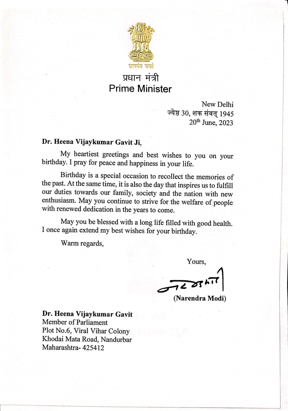अमेरिका दौऱ्या दरम्यान पंतप्रधान नरेंद्र मोदी यांची जगातील सर्वात प्रभावी नेता अशी प्रतिमा बनली आहे. मात्र जागतिक पातळीवर आणि देशात सुद्धा आपला प्रभाव राखणारे पंतप्रधान नरेंद्र मोदी हे लोकहितार्थ झटणाऱ्या सामान्य व्यक्तींच्या आणि लोकप्रतिनिधींच्या लहान सहान गोष्टींची दखल घेऊन आनंद व्यक्त करत असतात. त्यावर व्यक्त होऊन प्रेरणा द्यायला विसरत नसतात. हे देशभरातील जनतेने अनेकदा पाहिले आहे.  त्यांच्या मन की बात उपक्रमातून शेकडो तशी उदाहरणे पाहायला मिळाली आहेत. खासदार डॉक्टर हिना गावित यांच्या वाढदिवसाची विशेष दखल घेऊन शुभेच्छापत्र देणे त्यापैकीच मानले जात आहे.