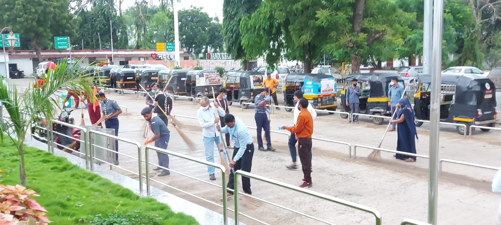 या मान्यवरांच्या हस्ते वृक्षारोपण करण्यात आले त्याचबरोबर नंदुरबार रेल्वे स्थानकाचा परिसर स्वच्छ करण्यात आला. तसेच स्वच्छता राखण्याची शपथ घेण्यात आली. नागरिकांनी, कर्मचाऱ्यांनी रेल्वे स्थानक व परिसर तसेच घर आणि परिसरातील स्वच्छतेला प्राधान्य द्यावे, आपला परिसर नेहमी स्वच्छ ठेवावा. त्यासाठी स्वत: तसेच इतरांना प्रेरीत करुन स्वच्छतेचे महत्व पटवून द्यावे. स्वच्छते विषयी जागृतता निर्माण करावी, तसेच या स्वच्छता अभियानात युवा तसेच नागरिकांनी सहभाग घेण्याचे आवाहन याप्रसंगी करण्यात आले. दरम्यान, आज जिल्हाधिकारी कार्यालयात स्वच्छ भारत अभियानाअंतर्गत स्वच्छ परिसराचे आयोजन करण्यात आले होते.